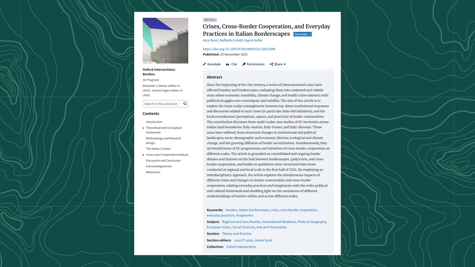 New Publication: “Crises, Cross-Border Cooperation, and Everyday Practices in Italian Borderscapes” by Buoli A., Coletti R. & I. Kofler (Oxford Intersections: Borders, 2025)